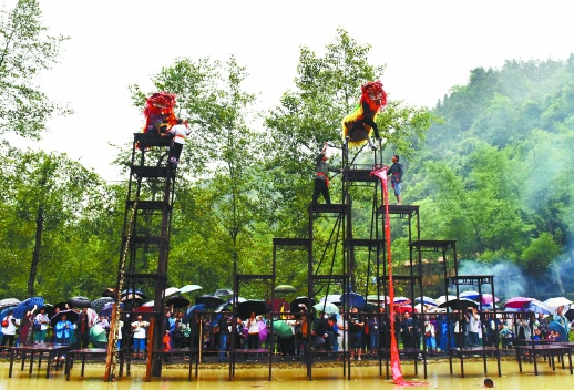 时刻新闻 —分享— 5月22日,苗族同胞表演舞狮。当天,苗族“四月八”活动在吉首市矮寨镇举行,来自吉首、花垣、凤凰、保靖等地的10000余名苗族群众冒雨参加。苗族“四月八”是苗族同胞传统节日,又称“亚努节”。 姚方 摄 来源:湖南日报 作者:姚方 编辑:李丽