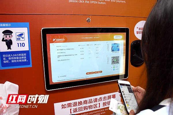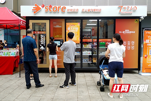 红网时刻湘潭7月1日讯(记者 凌雨晴)7月1日,记者在湖南省湘潭市岳塘区莲城步行街上看到,一家新型无人便利店出现在街头,不少市民在便利店门前排起了小长队。扫码注册进店、自助购物结算、电子商务支付……这一系列的新奇操作,引得不少行人驻足体验。