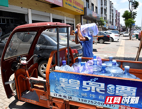 红网时刻湘潭7月21日讯(见习记者 刘桔元)7月18日,今夏进伏第二天。上午11点40分,湖南省湘潭市最高气温已高达37摄氏度。连日来的高温天气让市民增加了饮水量,桶装水的需求量与日俱增,送水工格外忙碌。他们的身影穿梭在城市大街小巷,头顶烈日为市民送上“甘泉”。