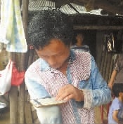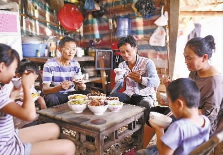 宋新安一家在简陋的老房子里吃中餐,其乐融融。妻子平时在镇上照料孩子上学。暑假里,一家人得以团聚。