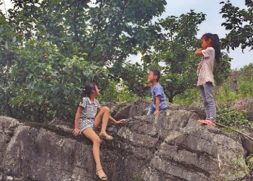 暑假里,山上茂密的果园成了孩子们的乐园。