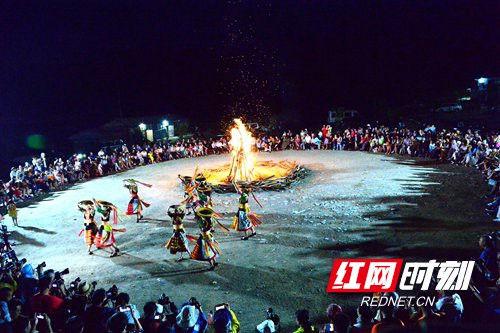 花瑶姑娘载歌载舞为游客举行篝火晚会。