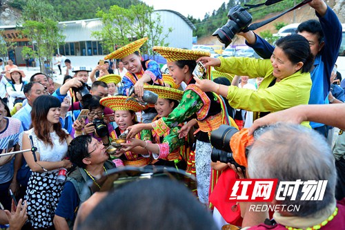 红网时刻8月10日讯(通讯员贺上升)8月9日,湖南省隆回县小沙江镇花瑶妇女正在龙瑶幽谷景区为游客敬酒“高山流水”。