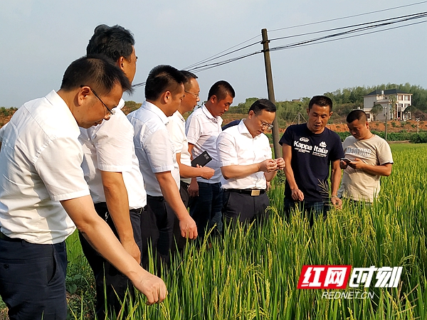 谈文胜(右三)在花石镇查看农作物受旱情况。