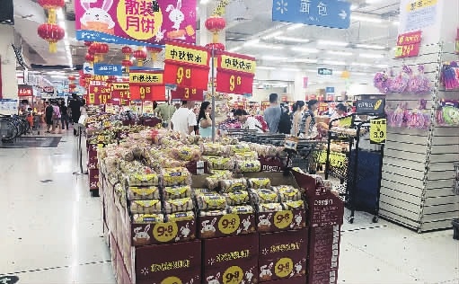 8月24日,在沃尔玛超市黄兴广场店,“中秋”主题的月饼货台摆放在醒目区域。 记者 陈柯妤 摄