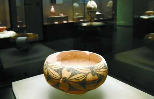 记者在现场看到的花卉纹彩陶钵,白色陶衣上绘出黑彩圆点和弧边三角形,衬托出白色的花卉纹。据介绍,这种花卉纹几乎遍布当时大部分原始文化村落,除了整个黄河流域之外,长江中下游地区、洞庭湖地区,甚至内蒙古、甘肃、山东等地均受到它强大的文化影响。