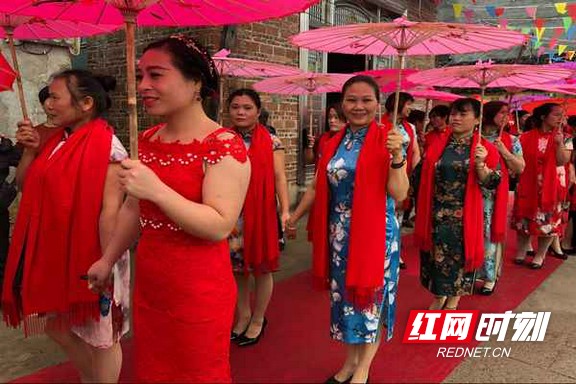 当天,道县梅花镇斯屋村人声鼎沸,锣鼓喧天。村中锣鼓队、仪仗队起舞启程,村民在道路两旁欢迎,村干部、村民代表引领200多名外嫁女身着端庄优雅的旗袍,以动人的身姿、优雅的步伐进入村联欢礼堂,她们互相联络感情、慰问村中特困户、高龄父老乡亲,男女老少围坐在一起观看节目,话家长里短,场面十分温馨感人。活动有旗袍表演、竹竿舞、唱歌,晚会活动精彩纷呈。