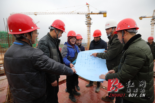 珠晖区农村和城市建设开发投资有限公司工作人员督察工程质量和安全施工。