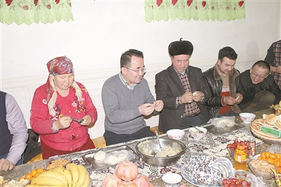 2018年2月14日,在阿克陶县皮拉勒乡依也勒干村5小队,纪检监察干部阿迪力·艾力(左二)和村民巴拉提·伊斯拉木一家人一起包饺子迎接春节的到来。(资料图片)
