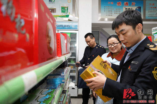 图为资兴市区一药店内,执法人员对待售保健品进行检查。