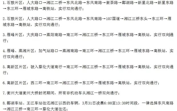 (一)体育中心周边以及凌合南路、双江南路、衡州大道新园路口至大庆路口、湘江东路湘水明珠下匝道处至船山东路匝道、粤新路至船山东路段、船山东路全段、耒水北路、湘江东路(滨江新城段)、009乡道、茶金路、茶兴路、金甲环形路、东三环福星庙收费站至衡州大道立交桥西边半幅、耒水东路船山东路立交桥至新园路南头、新园路衡州大道路口南段等分时段实行交通管制,管制期间禁止车辆和行人进入管制区域。