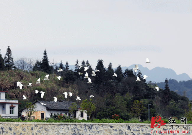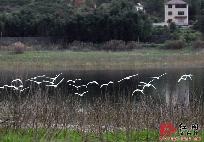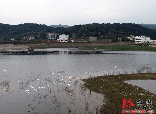 东江湖畔的资兴市白廊镇台前村(资兴市水产良种场)白鹭翩翩。