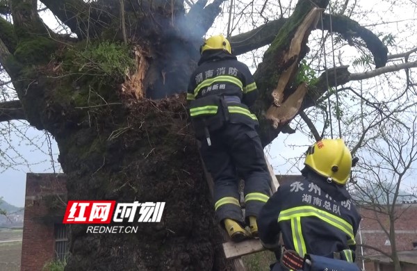 红网时刻永州3月28日讯(通讯员 蒋军君)3月27日早上,新田县金陵镇神堂下村一棵800多年的古银杏树树干洞内起火,火势不断增强,若不及时处置,这棵珍贵的古银杏树将毁于一旦。