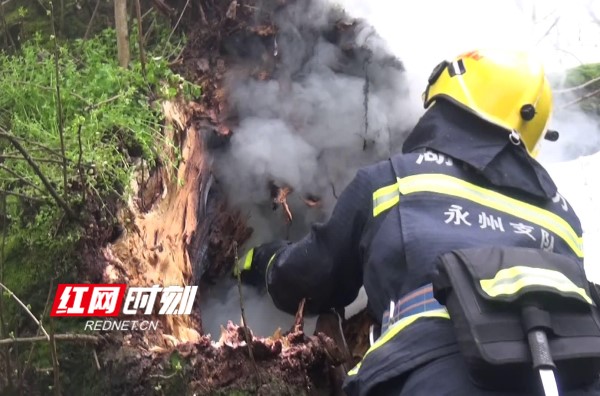 村里的村民采取各种措施,仍无法控制火势,只能向消防部门求助。该县消防救援大队接到村民报警后,迅速赶往现场处置。在事发现场,只见离地面四米多高的树干洞口不断地冒出浓烟,而且有不断增强的势头。消防员立即架设梯子,从古树洞口用水枪进行浇灌,通过一个多小时的灌水才将火势压住。随后,又与村民一起往古树洞内填埋泥土,再用消防车往古树内灌水,终于成功将火势彻底扑灭。