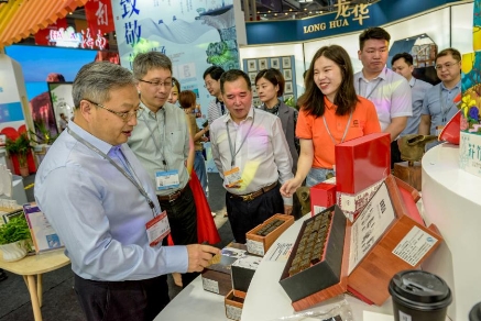 湖南省人大常委会副主任王柯敏(左一)、省文旅厅副厅长肖凌之(左三)以及各地宣传部领导在活字黑茶的展台驻足参观。