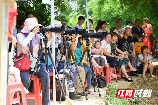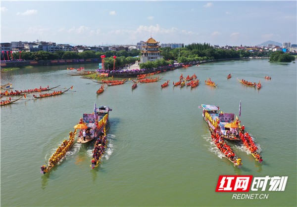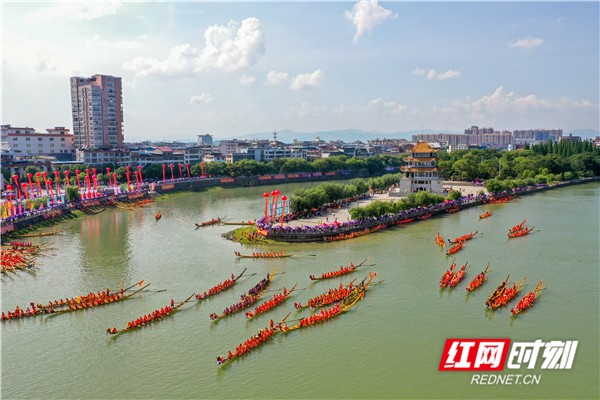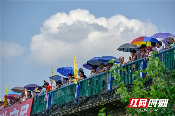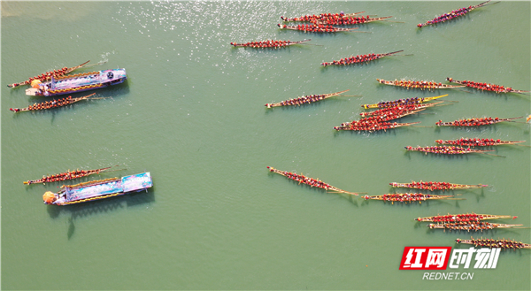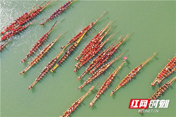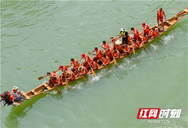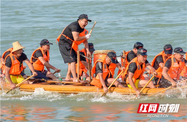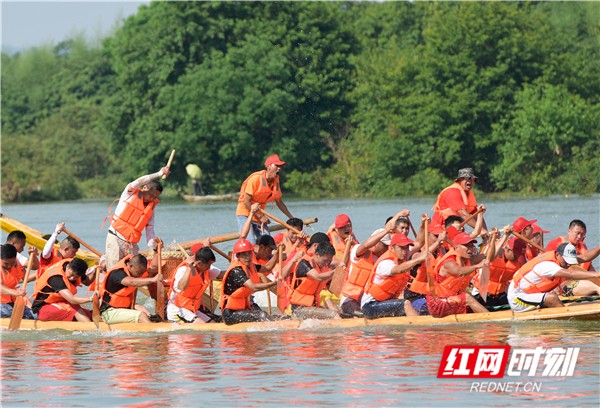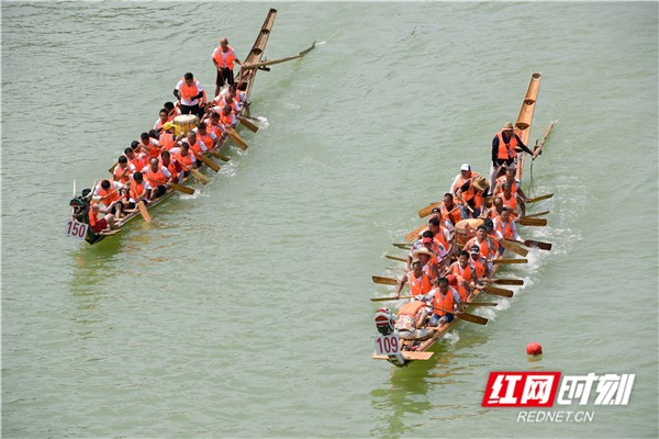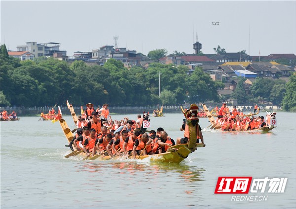 红网时刻6月5日讯(通讯员 蒋克青 周琳)6月3日,湖南省道县潇水河面上,村民划着龙船互相比拼。当日,“龙腾潇湘•2019”湖南省传统龙船赛(道县站)进入决赛,来自全省各地的144支参赛队伍、3400余名参赛队员在河面上展开500米直道竞速激烈角逐。
