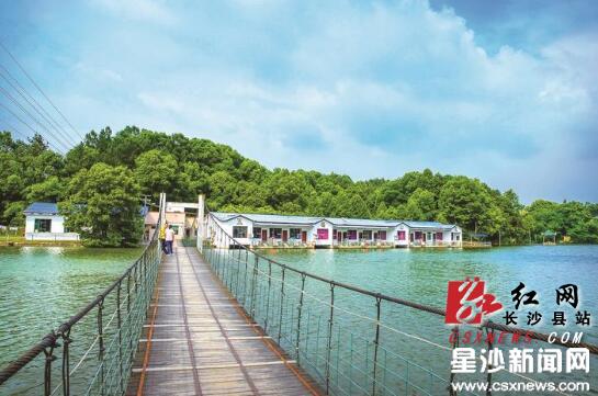 五福山庄内,波光粼粼,杨柳青青,走上铁索吊桥,一起放飞心情。