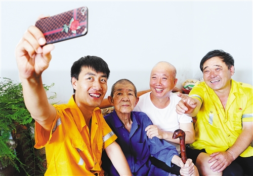 北京铁路局石家庄工务段娘子关线路车间的四代养路工徐建豪、刘连锁、武仲科、董彦科(从左至右)相聚在一起,用手机记录难忘瞬间。