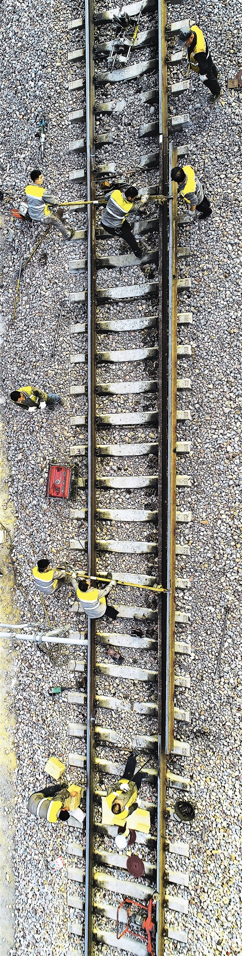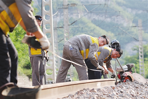 娘子关线路车间工人在进行换轨作业。靠着严格、精细的工作标准,他们养护的线路多年来一直是石太线上的“放心区段”。