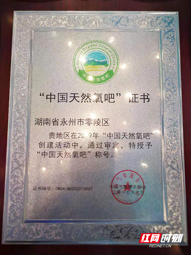 永州市零陵区获2019年度“中国天然氧吧”称号。