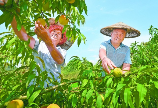7月28日,溆浦县祖市殿镇柳溪村生态桃业基地,果农喜采成熟的脆桃。近年,该镇通过贫困村、合作社、公司和农户之间的抱团发展,连片种植金秋梨、脆桃、杨梅等特色水果近8000亩,有效促进了当地农民脱贫增收。(记者 李健 通讯员 张微渺 摄影报道)