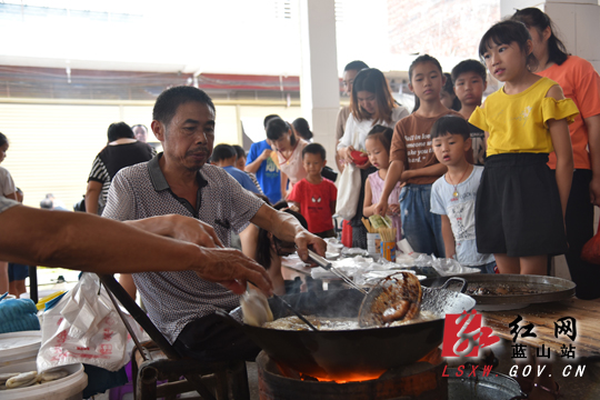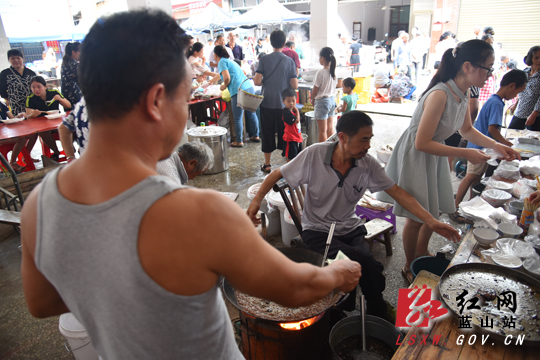 油茶粑粑是蓝山县最有名的特色小吃,而竹市镇赶圩摊上的味道是当地口碑最好的一家。每逢赶圩之日,附近的人才能一饱口福,排队等待是经常之事。旁边小孩眼直直地盯着锅里正在油炸的油茶粑粑,口水直流……