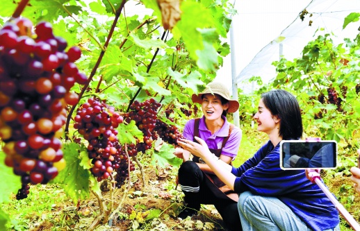 8月4日,蓝山县塔峰镇花果村花果庄园葡萄基地,果农用手机直播葡萄采摘过程。当天,该县举办葡萄采摘文化旅游节,通过电商平台现场直播采摘葡萄、品尝葡萄和介绍葡萄酒知识,吸引游客进村体验葡萄采摘,助力葡萄及系列产品销售,促进果农增收致富。杨雄春 摄