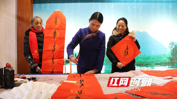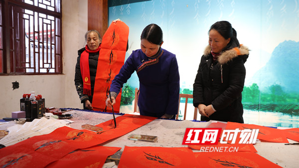 红网时刻1月18日讯(江永站记者 陈健林)春节临近,湖南省江永县的胡欣、蒲丽娟等5位女书传承人深入到千家峒、源口、兰溪等瑶族乡,把一幅幅散发着清新墨香的喜庆大红女书春联免费送给当地的瑶胞,送上了新年的美好祝福。