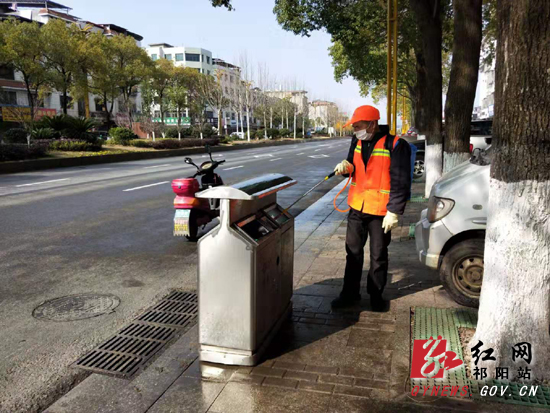 环卫工人正在给垃圾桶消毒。