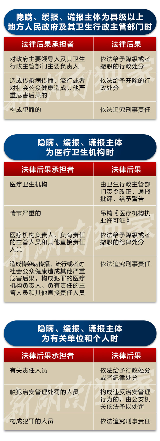 有关单位和个人隐瞒、缓报、谎报疫情的,对有关责任人员依法给予行政处分或者纪律处分;触犯治安管理处罚法,构成违反治安管理行为的,由公安机关依法予以处罚;构成犯罪的,依法追究刑事责任。