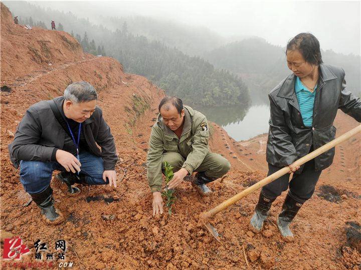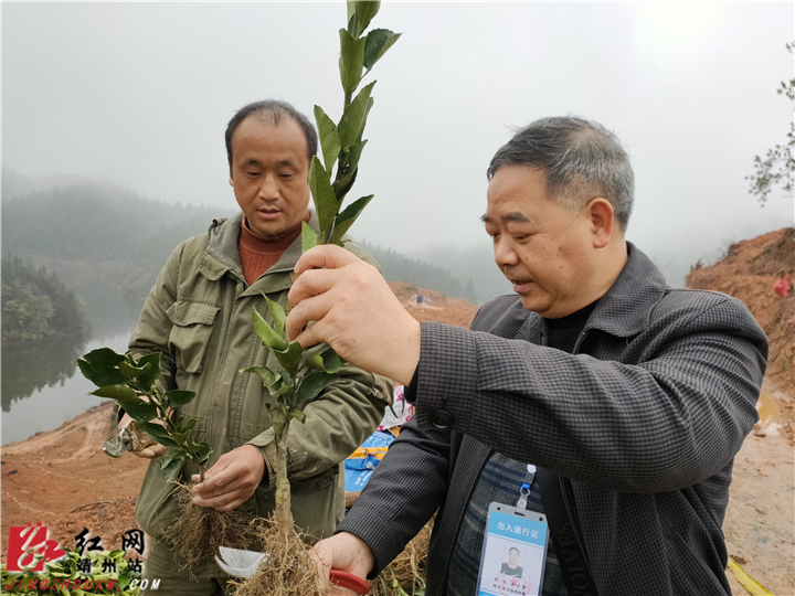 在黄光友的果园,靖州农业农村局经作站站长马小华正在生动形象地给他指导果树种植技术,以及后期果树管理方法,从而确保果树苗存活。