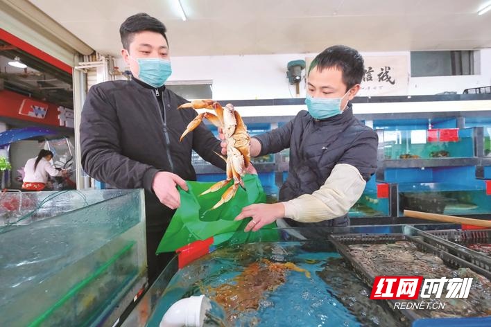 随着水渡河市场内的商户有序复工,前来选购、品尝海鲜的市民越来越多,图为在海擎水产店,员工忙着打捞市民选购的海鲜。章帝 摄