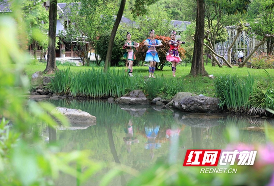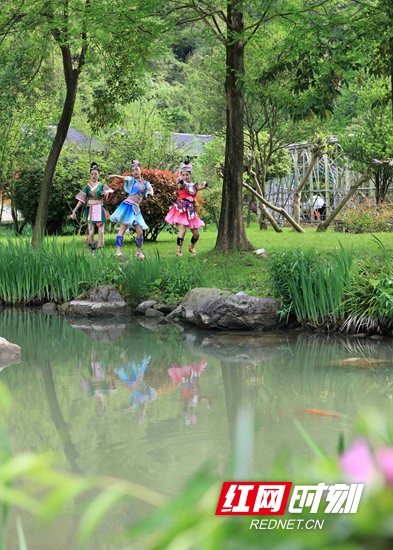 红网时刻张家界4月9日讯(通讯员 吴勇兵)4月9日,雨后天晴的湖南张家界市武陵源区黄龙洞景区生态广场,花红柳绿,春意盎然,身着民族服饰的少女轻舞其间,形成了一幅美丽和谐的生态画卷。