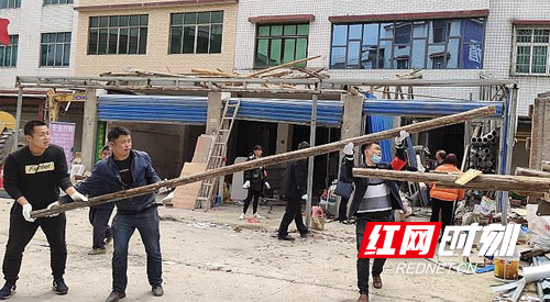 该镇干部群众在拆除马路市场雨棚。
