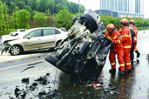 5月14日16时46分,一场暴雨导致路面湿滑,益宁城际干道衡龙新区管委会附近发生三车相撞交通事故,一名驾驶员被困。当地消防救援人员立即出动,交警、医疗部门也同时赶赴现场处置。