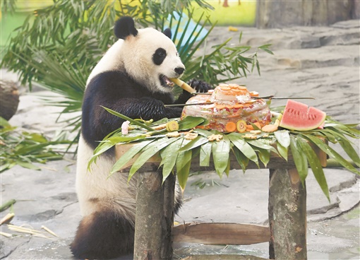 大熊猫“京宝”悠闲地享用饲养员精心准备的“生日蛋糕”。