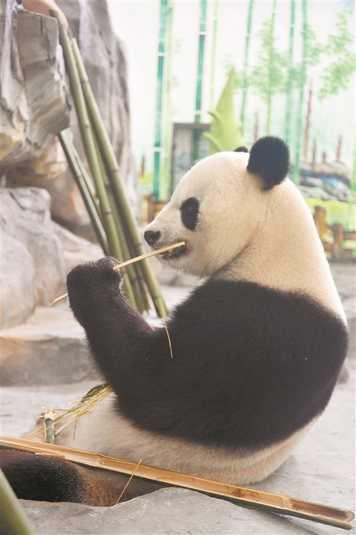 大熊猫“龙昇”悠闲地吃着竹子。