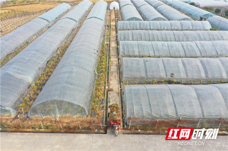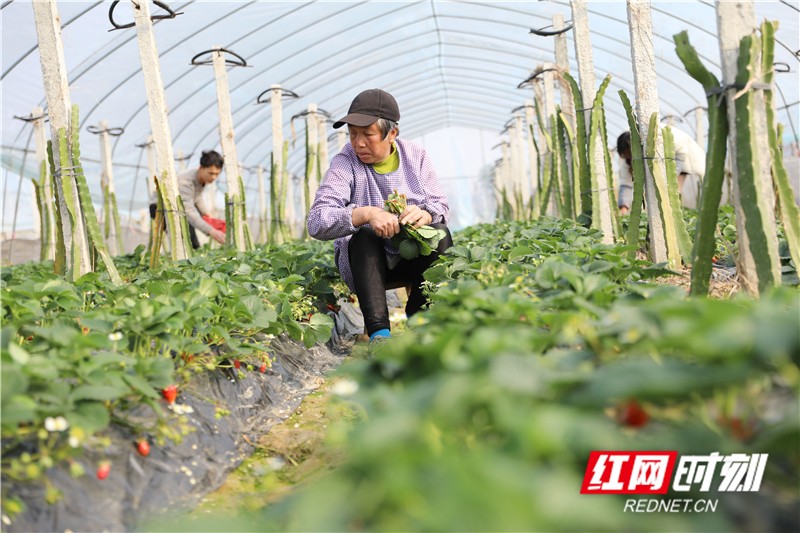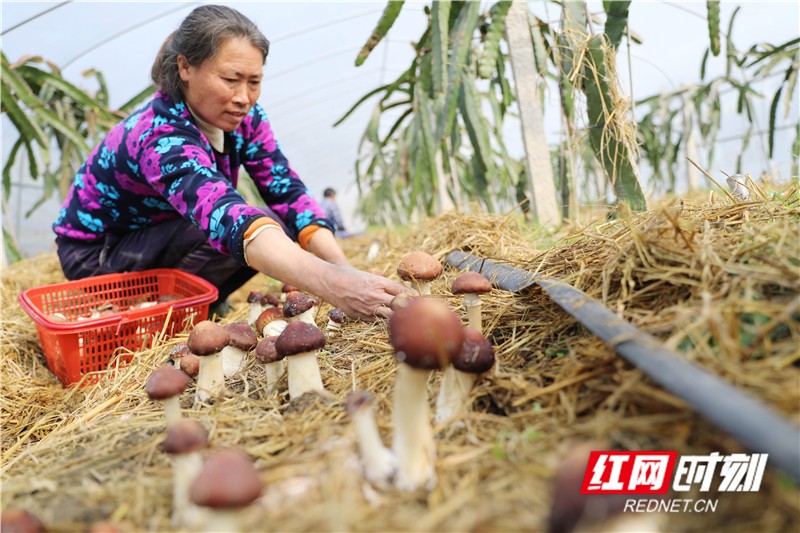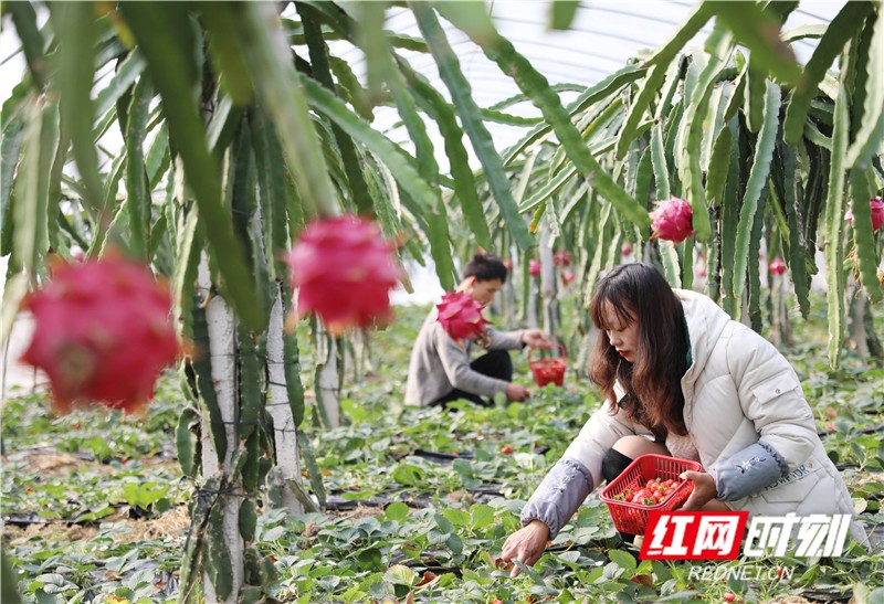 春节临近,湖南省道县大棚里的草莓、火龙果、松茸菌采摘上市,供应节日市场。近年来,道县注重农村产业结构调整,引导和鼓励农民建设农业大棚,在火龙果大棚内套种草莓、松茸菌,实现大棚增效、农民增收,助力乡村振兴。(通讯员 何红福)