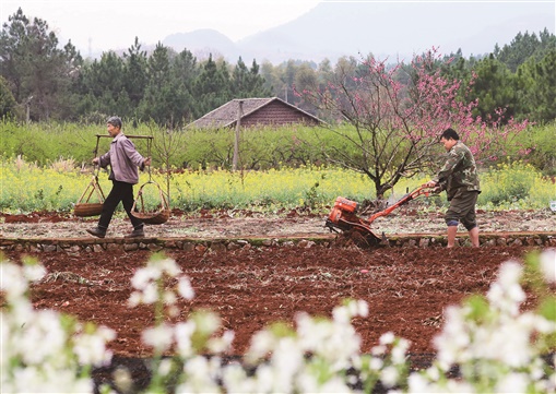 2月27日,新田县骥村镇黄栗山村,农民在田间劳作。春回大地,当地农民抢抓农时开展春耕春管作业,田间地头一片忙碌的景象。刘贵雄 摄