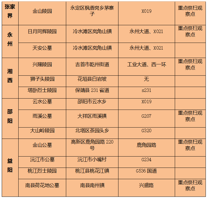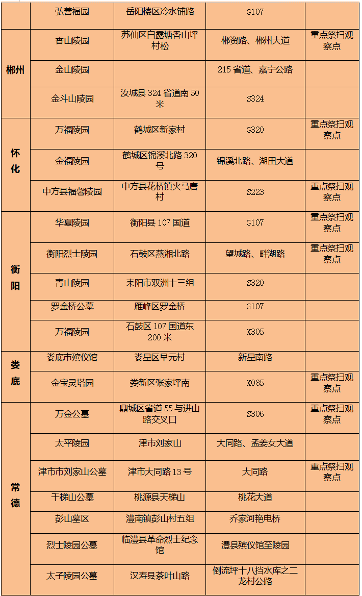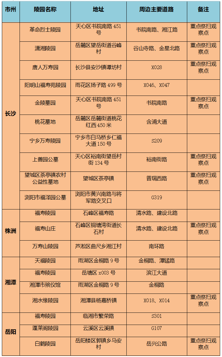 预测假期我省祭扫观察点共接待祭扫群众110万人次、疏导车辆25万台次,祭扫人数与2019年假期基本持平,疏导车辆有所增加。全省共有重点陵墓园54处,长沙市10处,常德市7处,衡阳市5处,湘潭、岳阳、益阳市各4处,株洲、郴州、怀化、湘西、邵阳市各3处,娄底、永州市各2处,张家界市1处,其中23处为国家、省群众祭扫观察点。