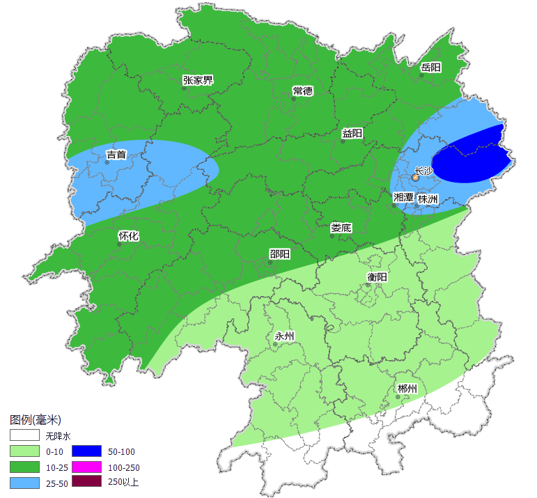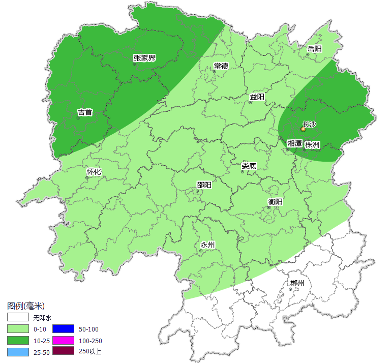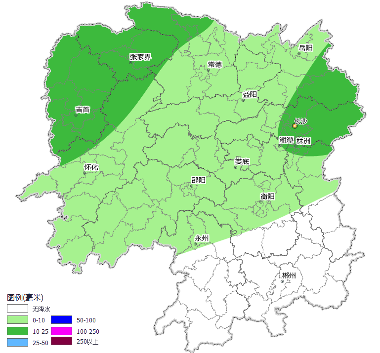 郴州、永州南部、株洲南部阴天间多云,其他地区阴天有小雨,其中湘西州、张家界、怀化北部、常德西部、岳阳东部、长沙东部、株洲北部部分地区中到大雨;北风2~3级;最高气温湘西、湘北13~15℃,湘东南25~27℃,其他地区15~17℃;最低气温湘东南15~17℃,其他地区10~12℃。