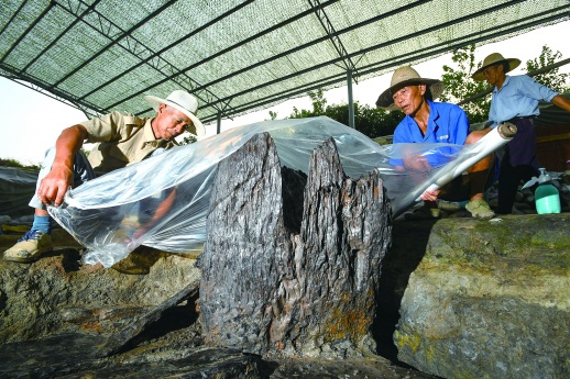 10月5日,位于澧县涔南镇鸡叫城村的鸡叫城遗址考古发掘现场,工作人员对木柱进行覆膜保护。记者 辜鹏博 摄
