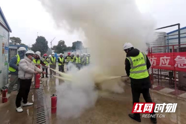 中建三局长沙鑫湘雅韵工地上,工人正进行消防安全演练。
