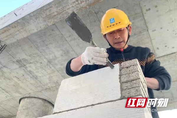 九江学院第二附属医院工地上,砌筑工正砌筑砖体。