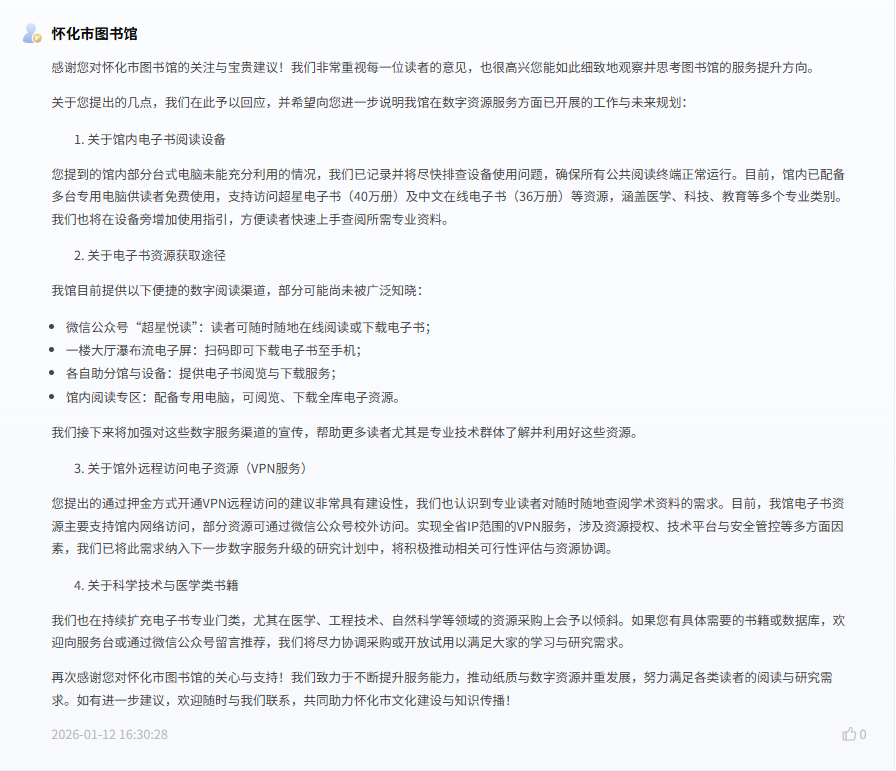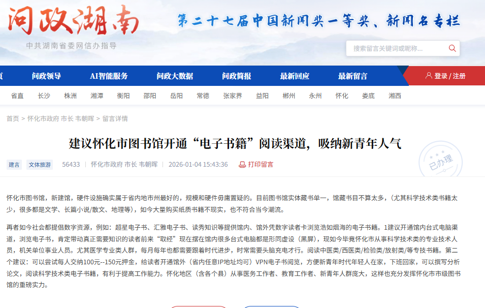 红网时刻新闻1月16日讯(记者 陈星晓)近日,有网友在红网《问政湖南》栏目留言,建议怀化市图书馆开通更便捷的“电子书籍”阅读渠道,以吸纳新青年人气,更好地服务当地专业技术人群。该建议迅速得到了怀化市图书馆的详细回应。