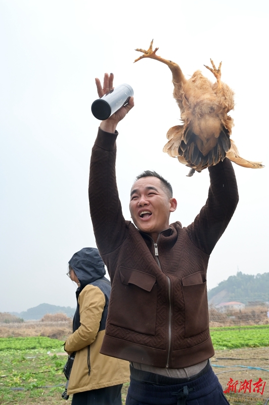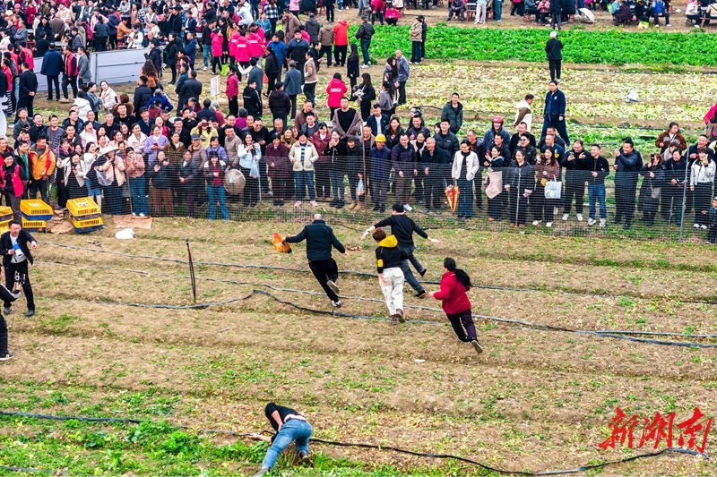 1月16日,双峰县洪山殿镇金桥村,游客在参加趣味捉鸡游戏。当天,金桥村贤才果蔬基地举办杀年猪体验活动。游客们参与捉鸡、摸鱼等农趣体验,共享杀猪饭,感受浓浓乡村年味。李建新 谢姣如 摄影报道(湖南图片库)