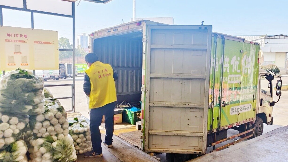 为了将“雨湖蔬鲜”品牌推向更广阔的市场,湘潭绿丰公司及湘潭兴农美公司,启动“本地深耕+湾区拓市”的双轮驱动销售模式,通过政企联动,构建起高效的产销对接网络。自1月9日起,湘潭市雨湖区斗盘蔬菜产销专业合作社每日稳定向湘潭兴农美公司供应1吨优质“矮脚白”。湘潭兴农美公司依托成熟的冷链物流体系,确保新鲜采收的蔬菜不仅快速走上本地市民餐桌,更在48小时内直达千里之外的粤港澳大湾区各大商超与农贸市场的货架。绿丰公司坚持“门店网络+流动供销”双线并进:以前置仓式的门店网络为支点,以“流动供销进社区”服务为延伸,对“矮脚白”等特色农产品实施统一采购与高效配送,直供社区。各门店均设主题专柜进行突出陈列,并配以导购推荐与社群宣传,持续强化“本地当季、新鲜健康”的消费认知,让当季风味触手可及。