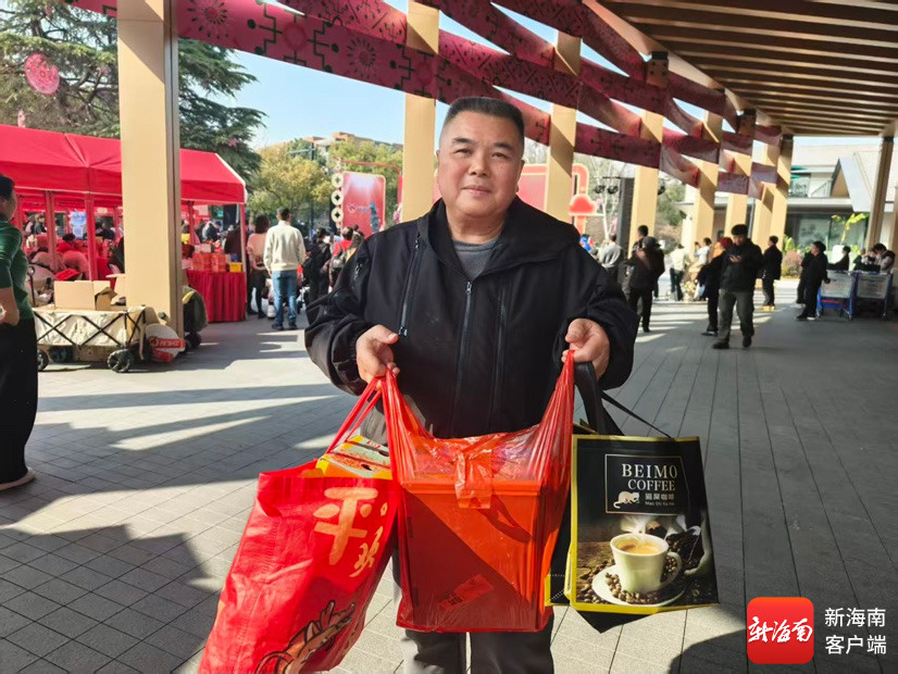 林先生展示自己选购的海南年货。记者 颜乐驰 摄
