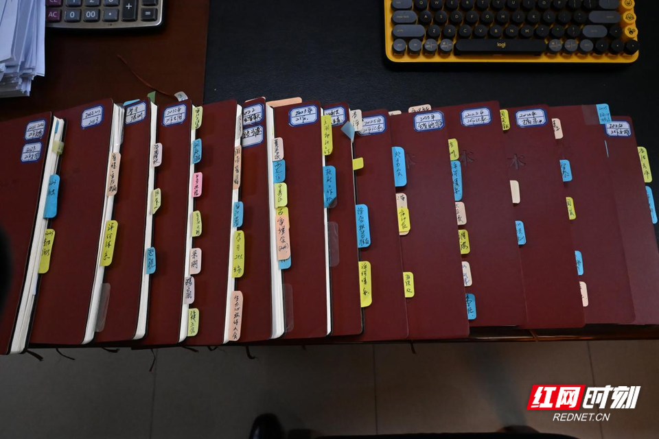 她的工作笔记本会按年份分类、贴满标签,透着细心沉淀的一面。
