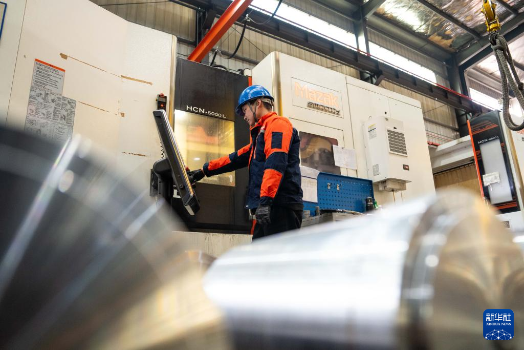 1月14日,在位于常德高新区的湖南佳鸿机械股份有限公司,工人在生产风力发电机滑动轴承。